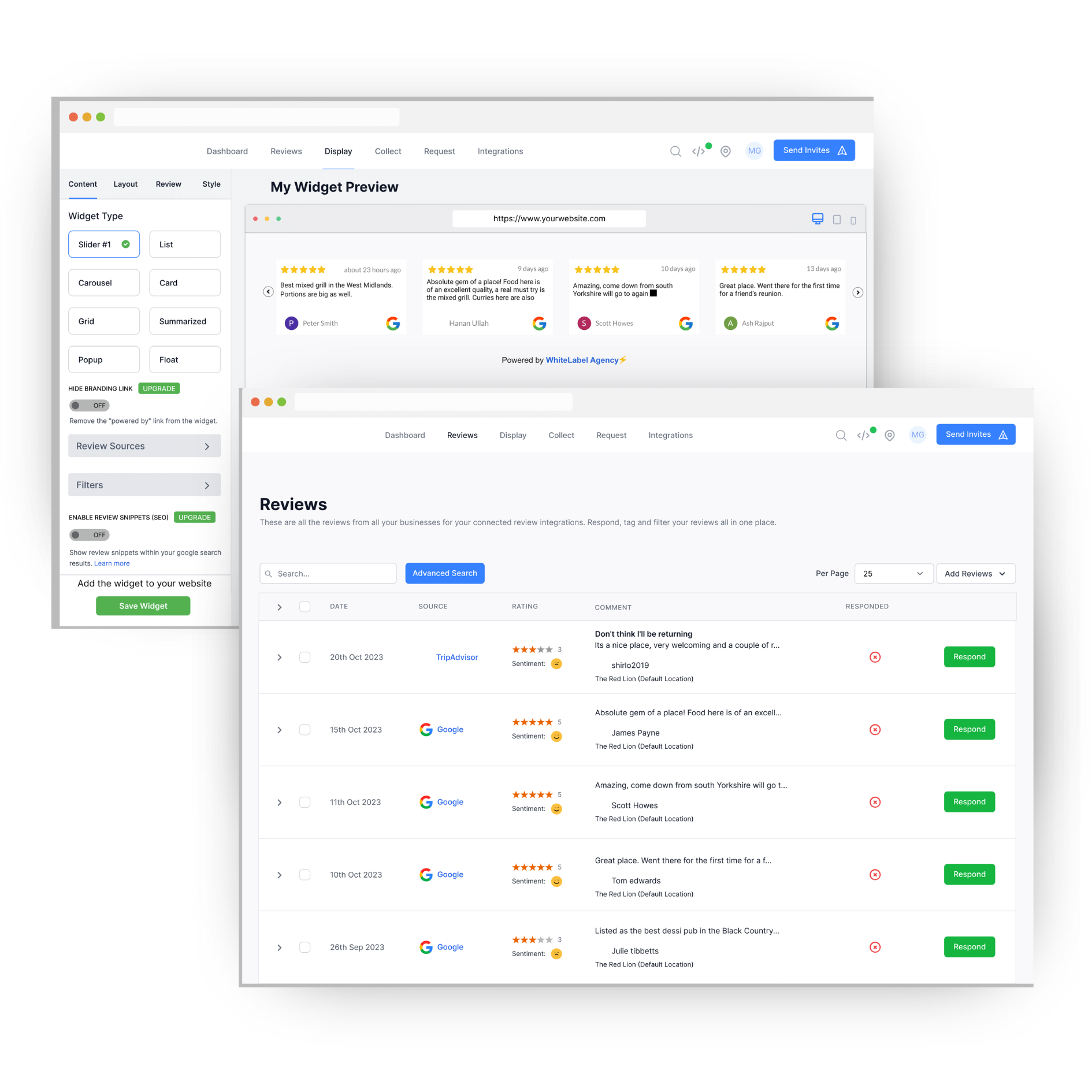 Showcase your reviews anywhere with just 3 lines of code. Choose from our sleek, responsive templates and customize them to match your branding, or create your own with our REST API.